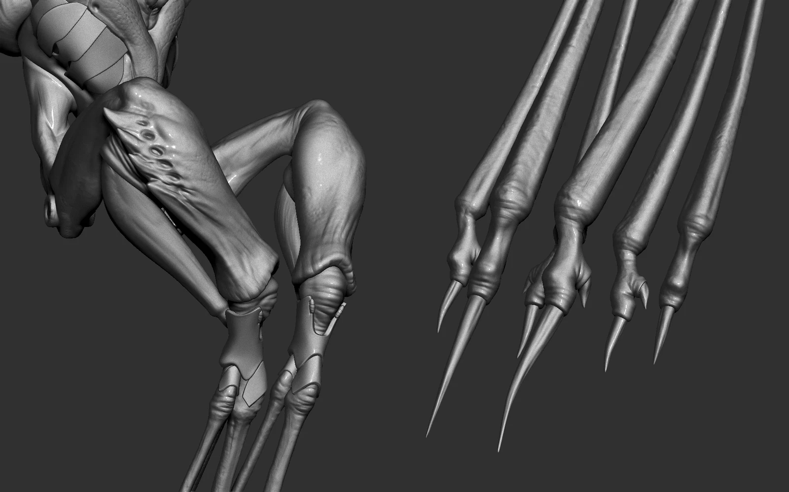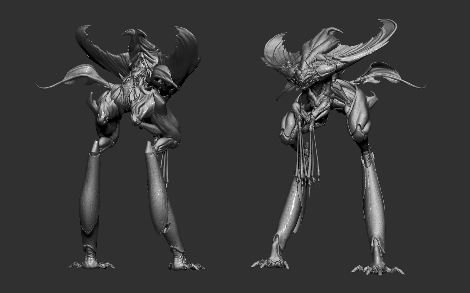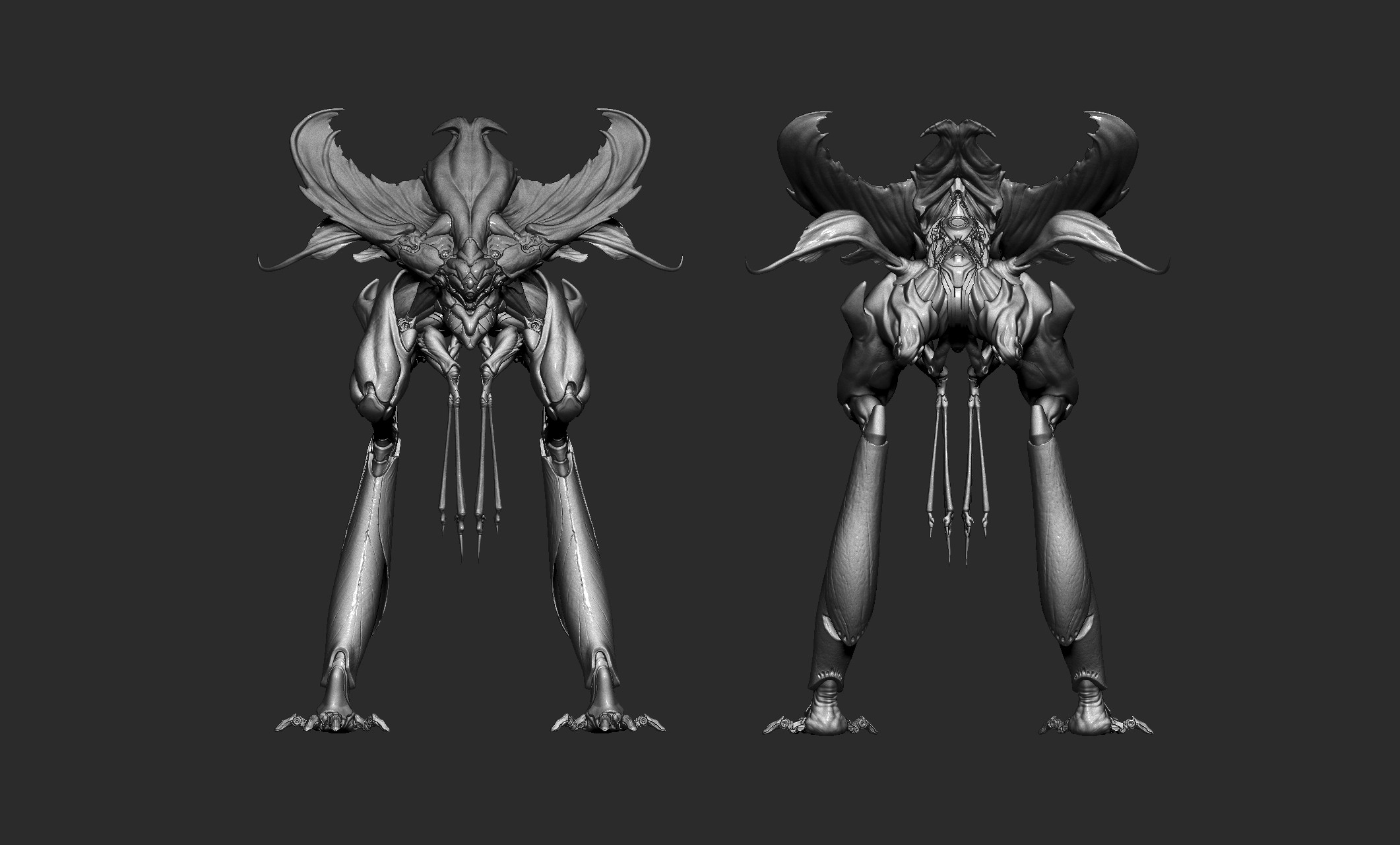 Since the concept mainly shows the front view, I had to explore and design some parts of the back myself. I added a bit of biomechanical and hard surface elements around the back and feet, which is something I personally enjoy doing.