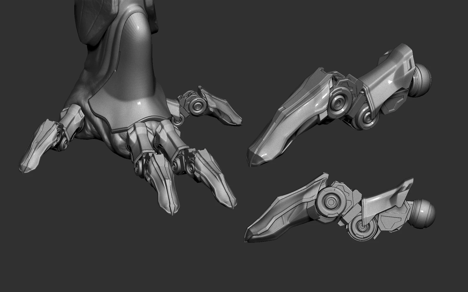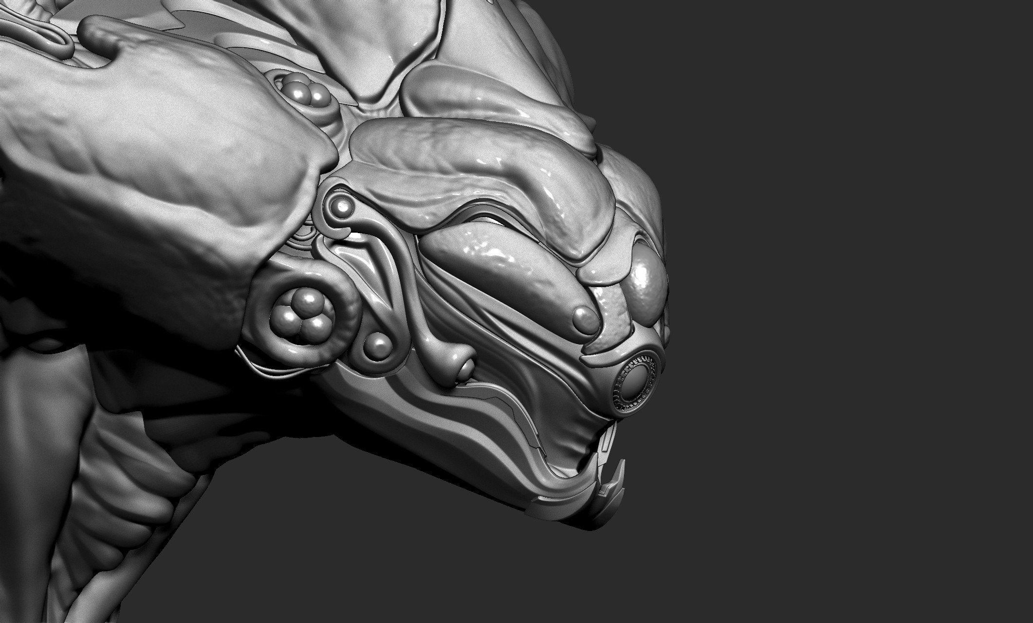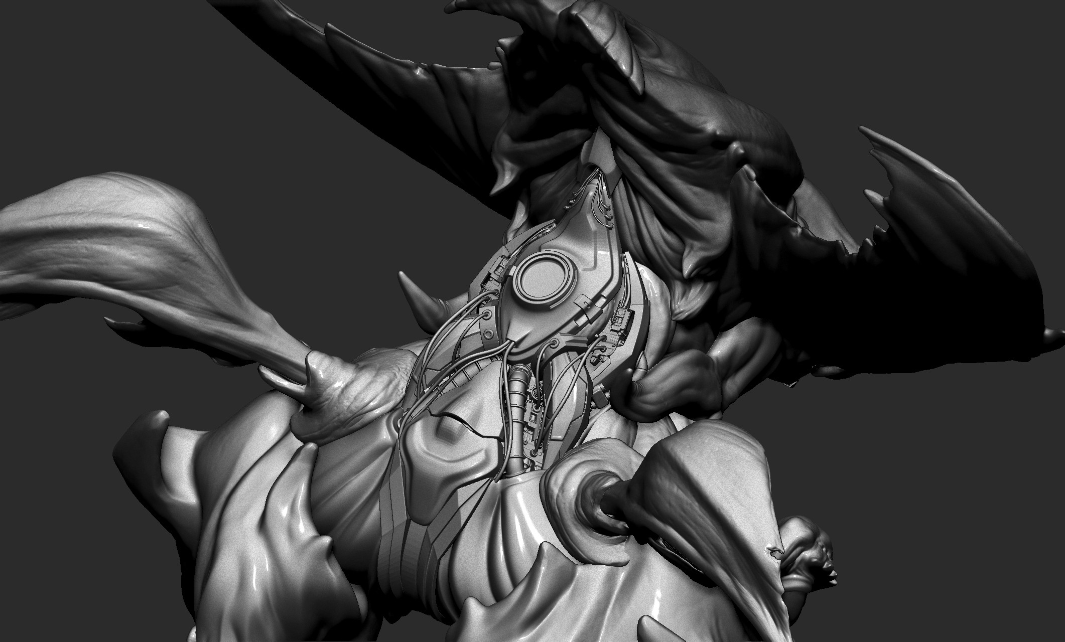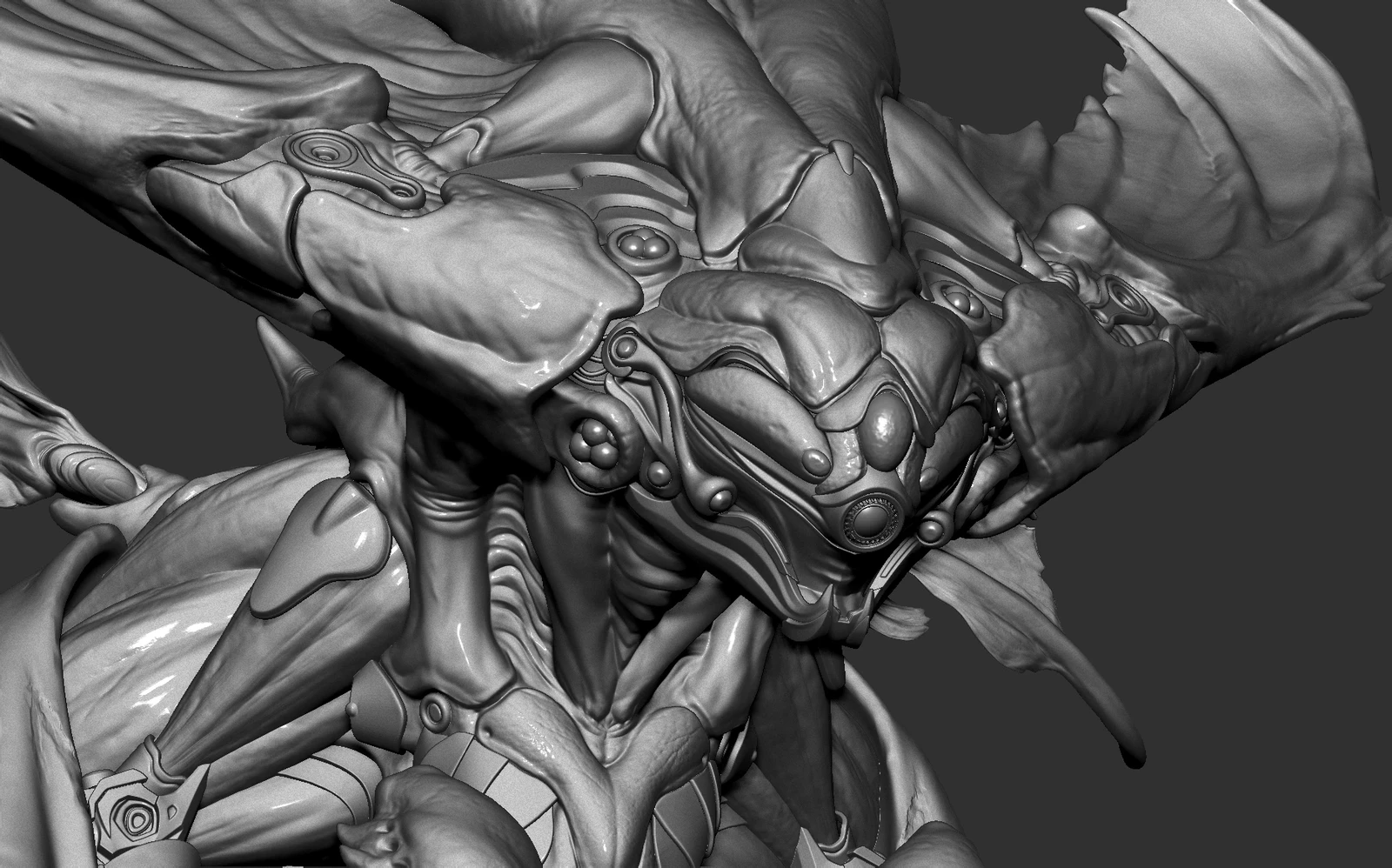 Since the concept mainly shows the front view, I had to explore and design some parts of the back myself. I added a bit of biomechanical and hard surface elements around the back and feet, which is something I personally enjoy doing.